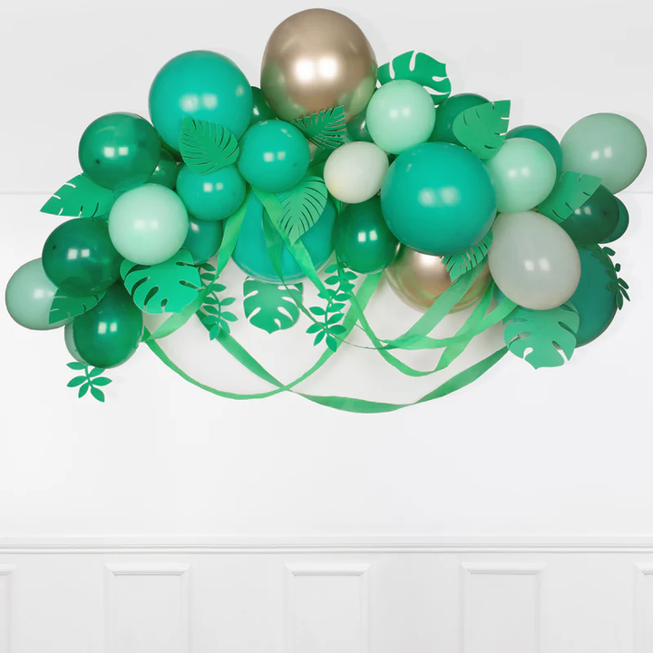 Wenn Sie auf der Suche nach einer trendigen Partydekoration sind, dann ist dieser Ballonbogen genau das Richtige für Sie! Mit seinem wunderbaren Mix aus Ballons, Papierblättern und Krepppapier-Luftschlangen ist er die perfekte Kulisse für eine Safari- oder Dschungelparty.