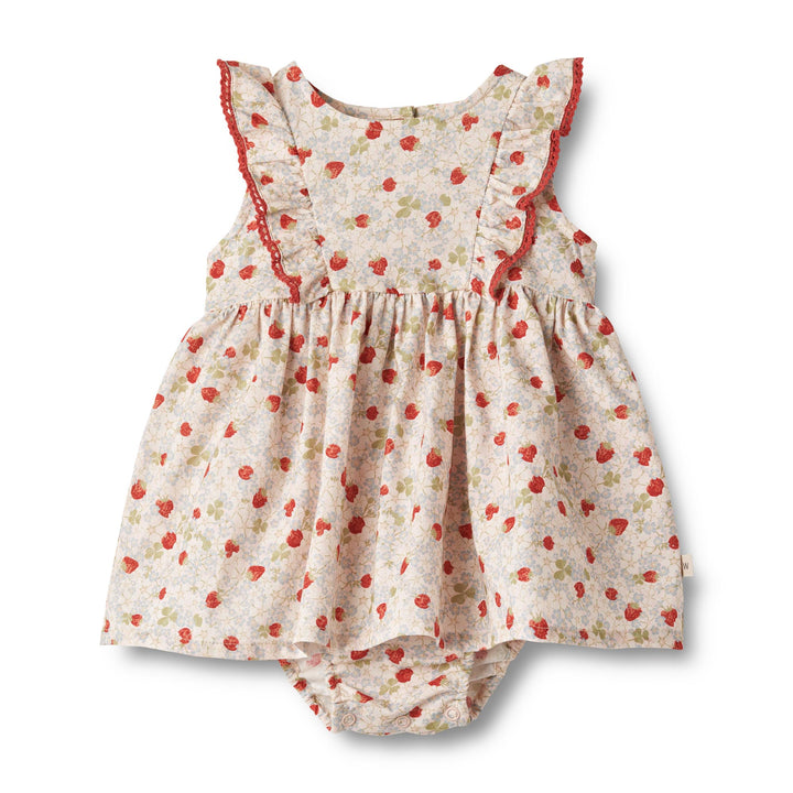 Hübsches ärmelloses Anzugskleid mit Druck aus weich gewebter Bio-Baumwolle für Babys.