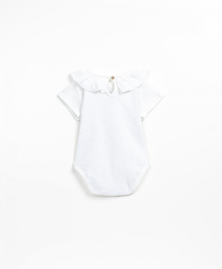 Der Body aus Bio-Baumwolle hat ein Detail am Kragen, eine Öffnung am Rücken mit Kokosnussknöpfen und eine Schrittöffnung mit nickelfreien Metallfedern.