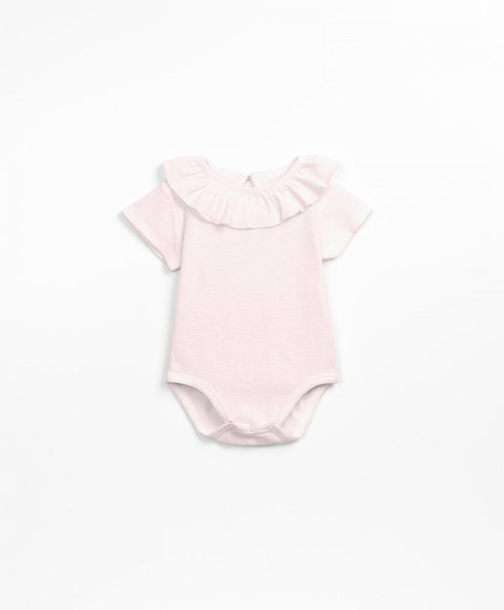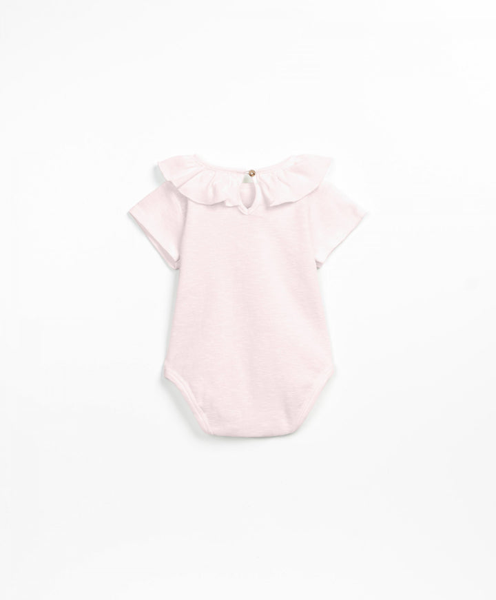 Der Body aus Bio-Baumwolle hat ein Detail am Kragen, eine Öffnung am Rücken mit Kokosnussknöpfen und eine Schrittöffnung mit nickelfreien Metallfedern.
