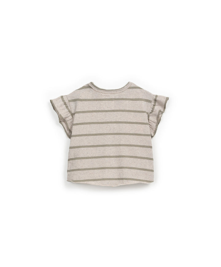 Dieses T-Shirt ist aus Jersey-Material mit recycelten Fasern hergestellt. Seine Zusammensetzung enthält 15 % unseres recycelten Re(Play)-Garns. Das gestreifte Modell hat einen Rundhalsausschnitt, eine Öffnung an der Schulter mit Kokosnussknöpfen und eine Brusttasche.