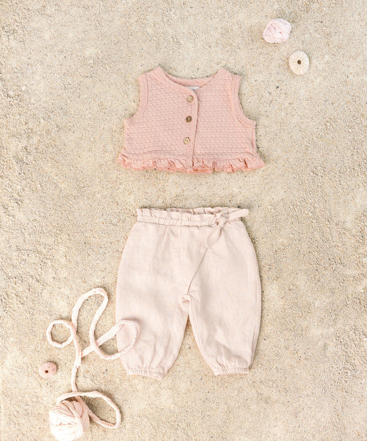 Dieses Oberteil aus Bio-Baumwolle hat einen Rundhalsausschnitt und eine Frontöffnung mit dekorativen Kokosnussknöpfen am Saum.