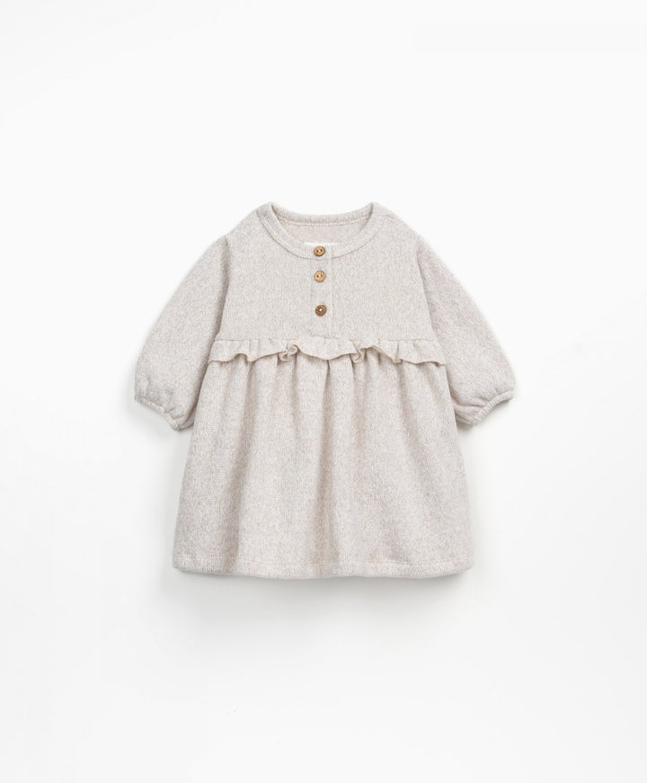 Dieses schöne Kleid verfügt über einen runden Halsausschnitt, eine Knopfleiste mit Kokosknöpfen auf der Vorderseite, elastische Bündchen und eine Rüscheneinsatz auf der Brust.